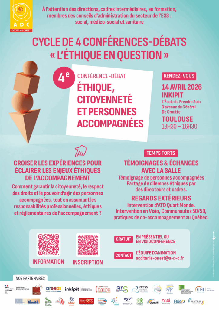 Ce quatrième et dernier séminaire des débats éthiques de la délégation ADC Occitanie Ouest visera donc à explorer et à mettre en résonnance la manière dont les personnes vulnérables ont pu vivre leurs divers accompagnements (administratifs, éducatifs, médico-sociaux, psychiatriques, sociaux, etc…) avec les questions éthiques que les manageurs peuvent se poser lorsqu’ils ont à garantir la citoyenneté et le pouvoir d’agir, mais aussi la sécurité de ceux dont ils ont momentanément la « charge ».